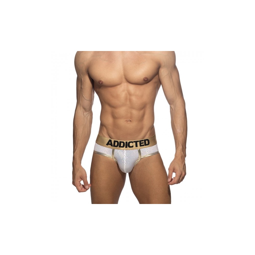 Material has a very subtle sheer effect, giving off a hint at your own golden jewels inside. Complimenting golden hem detailing with a brilliant shine, as well as a golden, super-stretchy waistband with ADDICTED in bold across the front.